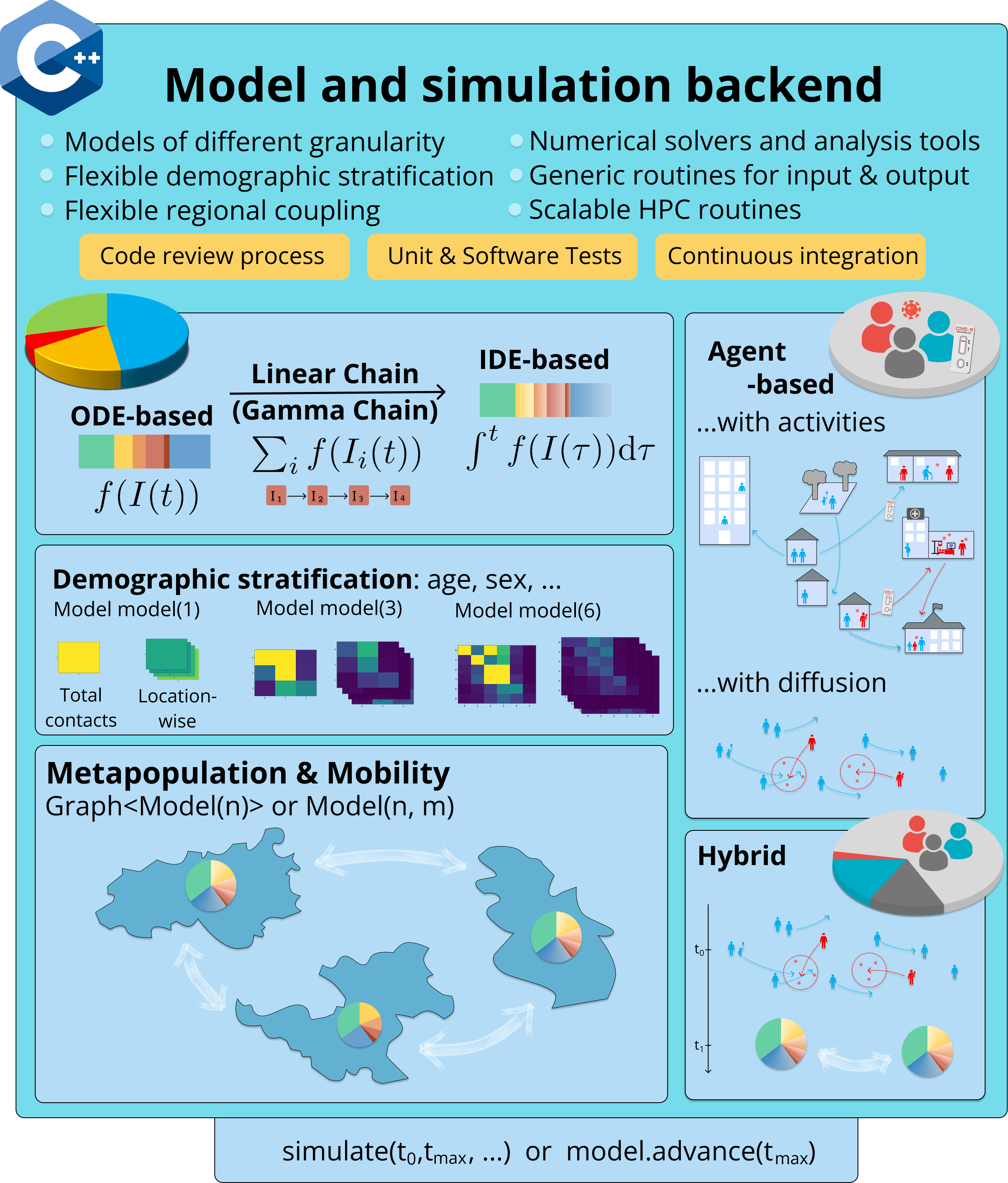 The MEmilio library uses a modular organization of models where compartmental or aggregated models based on ODEs (ordinary differential equations) without and with Linear Chain Trick, IDEs (integro-differential equations), and SDEs (stochastic differential equations) share a maximum properties and interfaces (implemented in the memilio folder) to allow simple and straightforward model adaption with, e.g., demographic or spatial stratification (e.g. found in the memilio/mobility folder to create metapopulation models) as shown in the following figure. Agent-based models are furthermore harmonized with most structures such as parameters, contact patterns, and non-pharmaceutical interventions (e.g. found in memilio/epidemiology).